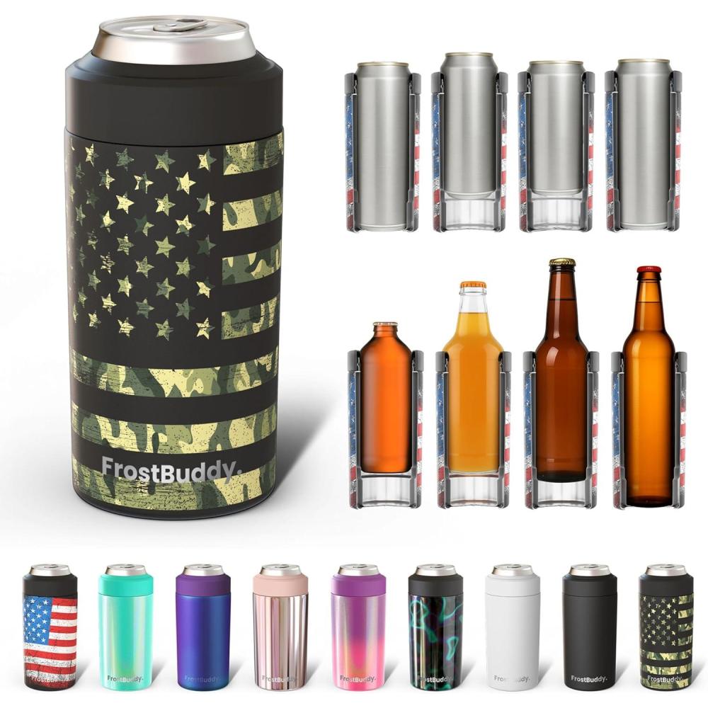 imageFrost Buddy Universal Can Cooler  Fits All  For Regular 12 ampamp 16 oz or SlimSize Bottles  Insulated DoubleWalled Stainless Steel Copper KissCamo Flag