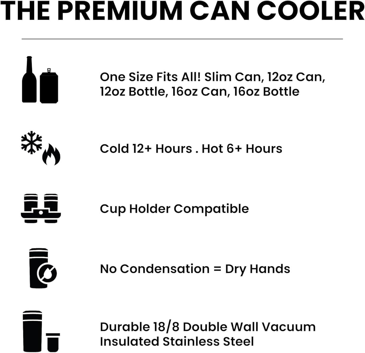 FIVE SIZES IN ONE: This is the ONLY Universal can insulated cooler for you! The perfect can keeper for your cans, slim cans, and bottles. Finally! No more switching coolers! Drink whatever size of drink you want! This can cooler fits your favorite 12oz cans and slim cans, 16oz cans and bottles all in one.