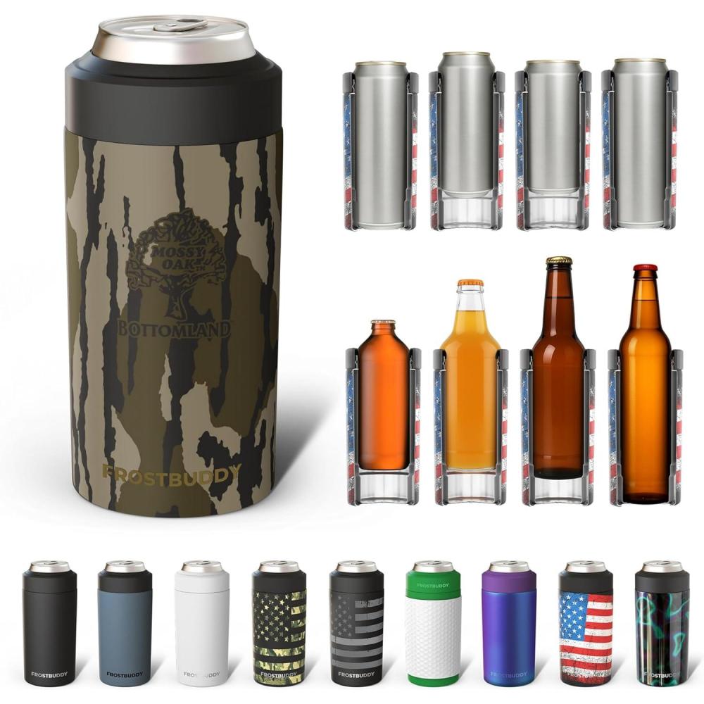 Frost Buddy Universal Can Cooler - Fits all - Stainless Steel Can Cooler for 12 oz & 16 oz Regular or Slim Cans & Bottles - Stainless Steel (Merry Marbleous)(Mossy Oak Bottomland)