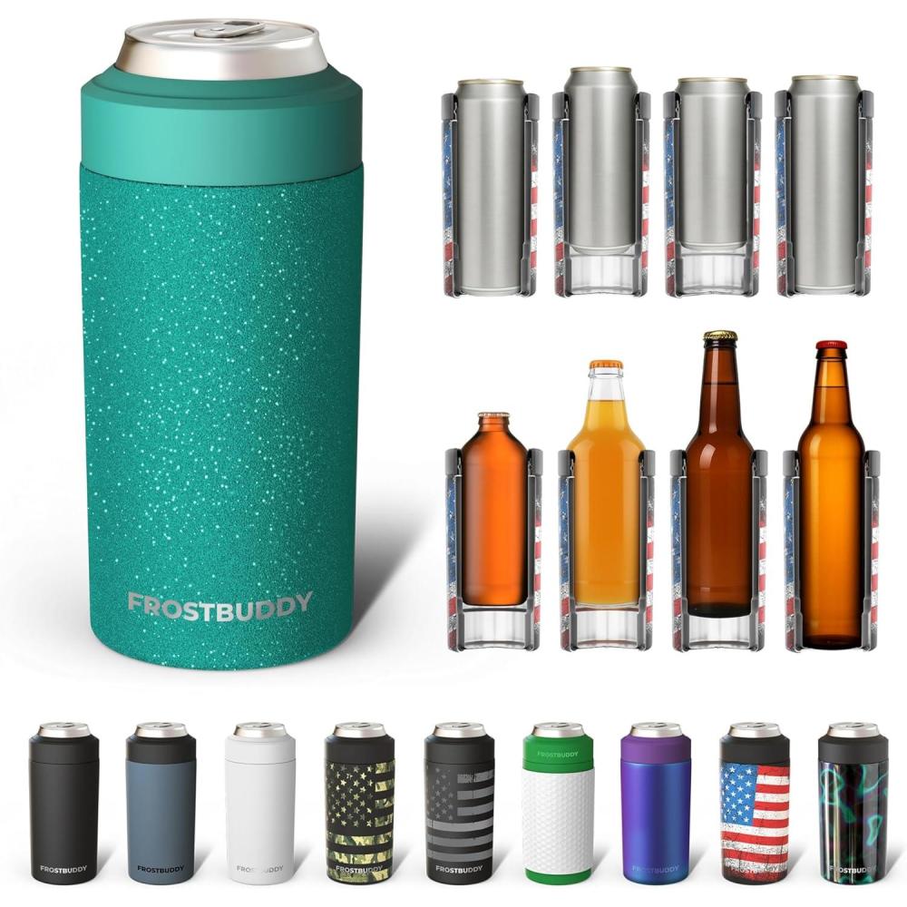 Frost Buddy Universal Can Cooler - Fits all - Stainless Steel Can Cooler for 12 oz & 16 oz Regular or Slim Cans & Bottles - Stainless Steel (Merry Marbleous)(Teal Glitz)