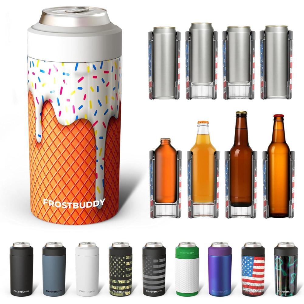 Frost Buddy Universal Can Cooler - Fits all - Stainless Steel Can Cooler for 12 oz & 16 oz Regular or Slim Cans & Bottles - Stainless Steel (Merry Marbleous)(Vanilla Ice Cream)